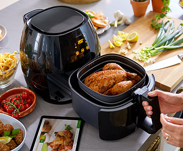 Köstliche Gerichte mit bis zu 90% weniger Fett*: Die Heißluftfritteuse von Philips. Frittieren mit Luft macht das Essen außen knusprig und innen zart – und das selbst bei einer Zugabe von wenig oder gar keinem Öl. *im Vergleich zu Pommes aus einer herkömmlichen Philips Fritteuse