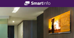 SmartInstall ermöglicht die Voreinstellung von Fernseher-Einstellungen und die Aktualisierung von Fernsehern von einem einzigen Standort aus per Fernzugriff. SmartInfo macht es möglich, diese Information zu teilen, Ihre Marke hervorzuheben und Dienstleistungen wie Ihre Restaurants oder Ihr Spa zu promoten und eine zusätzliche Einnahmequelle aufzutun – ohne ein separates System.